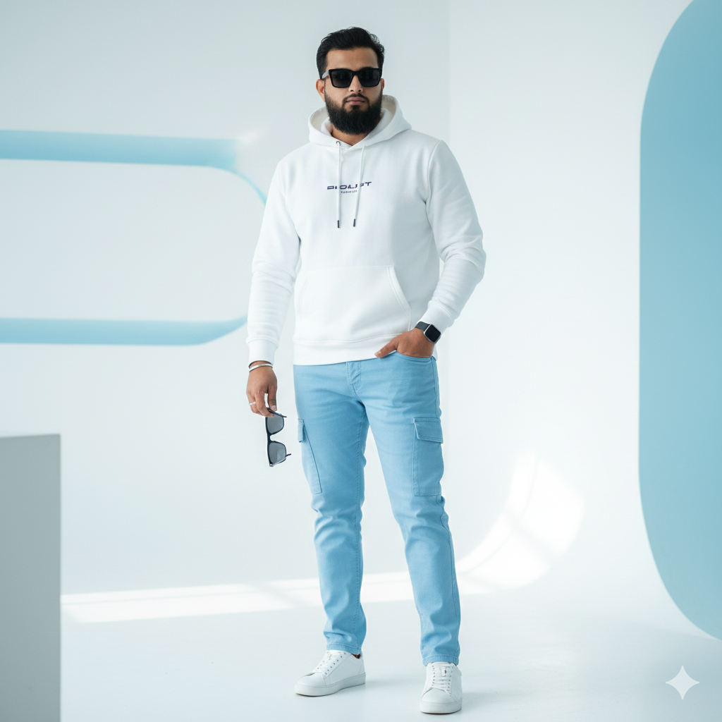 A complete portrait of a young man with a beard, exuding charm and style, dressed in a tidy white hoodie featuring black text and light blue slim-fit cargo trousers. He wears white sneakers and a black wristwatch, holding sunglasses in his left hand. His right hand rests comfortably in his pants pocket. The background is a tidy, minimalistic studio with high-key lighting, featuring white and gentle light blue architectural details that produce a trendy, luminous, and sleek look. It is a professional fashion photo shoot. The face remains unchanged, and he wears dark sunglasses.