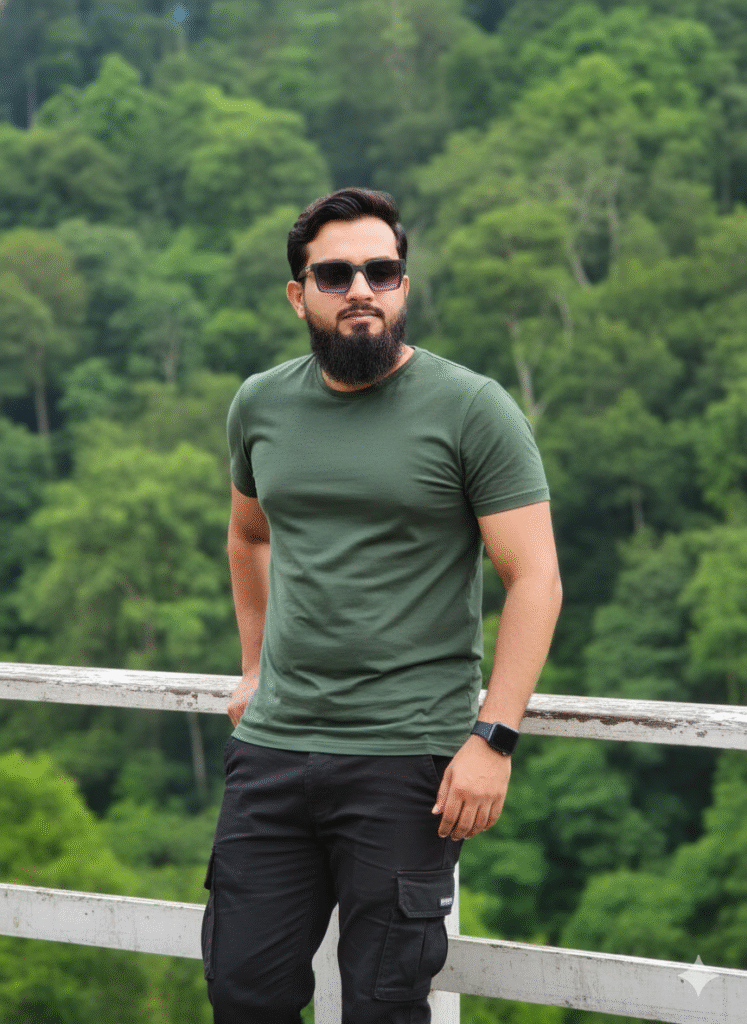 A young individual sporting dark, neatly arranged hair and a light-colored beard, donning black shades, a snug green tee, and black cargo trousers featuring various pockets. He is positioned outside on a white barrier, with a vibrant green woodland in the backdrop. His demeanor is laid-back, slightly leaning against the barrier, with his right hand resting on it, while his left hand dangles by his side. Additionally, he has a black watch on his left wrist, and his expression mirrors the one in the previously uploaded photo.