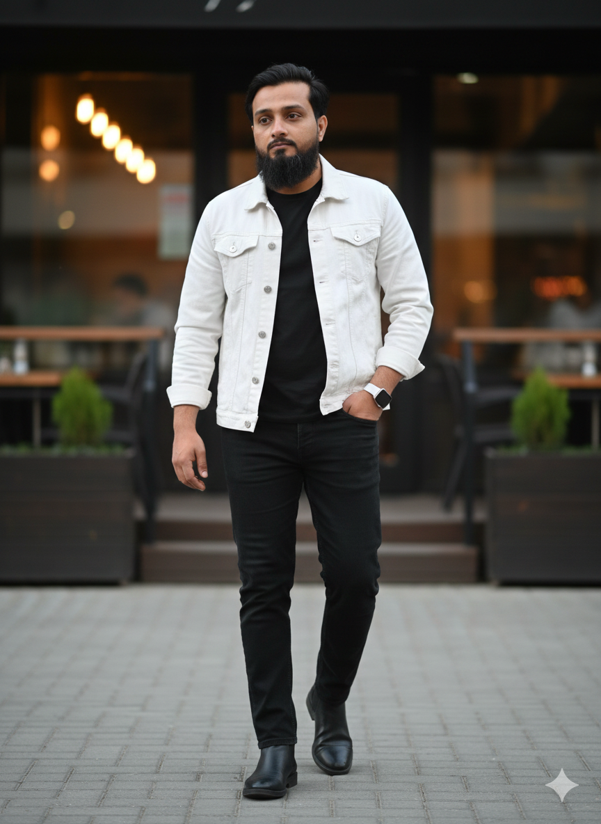 A youthful and attractive male, appearing about 30 years old, features an authentic face that doesn’t alter; his hair gives an incredibly lifelike appearance in 8k resolution. The young man is strolling outside near a restaurant, dressed in black slim-fit jeans and black Chelsea boots. He has a plain black t-shirt underneath his pants and a white denim jacket on top. In his left hand, he carries a square smartwatch with a white strap, while one of his right hands rests in his pocket. The background is subtly blurred for a realistic 8k effect.