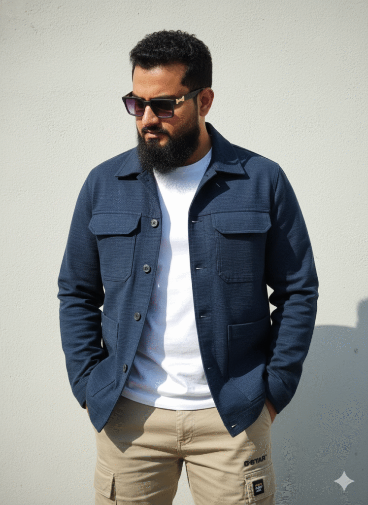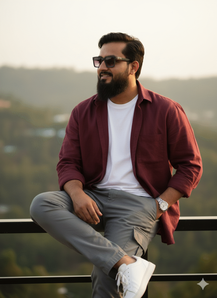 A loose maroon linen top, a white t-shirt, and grey cargo trousers (lacking side pockets), paired with white sneakers and a silver analog watch on his left wrist. Strong, influencer-style appearance with a relaxed pose (one leg crossed, hand in pocket, glancing to the side, smiling). Fuzzy background of a hill station, using natural light, high contrast, embodying a Gen Z style. The individual displays identical facial features, hairstyle, and beard shape as mentioned in the reference, “his haircut and beard are of the same style”.