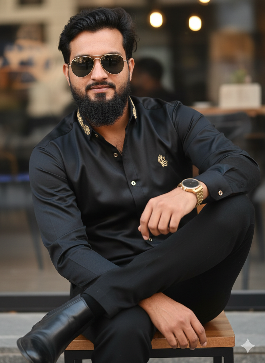 A highly realistic 8K DSLR cinematic image of a fashionable young male with tousled hair and a confident persona. Utilize the reference image to achieve perfect facial resemblance — maintaining identical facial features, eyes, grin, expression, and skin quality. He is dressed in an upscale black silk shirt from a designer, featuring delicate golden accents, paired with tailored slim-fit black slacks, top-quality black leather Chelsea boots, a premium gold wristwatch, and aviator sunglasses with gold rims. Keep the face unchanged.