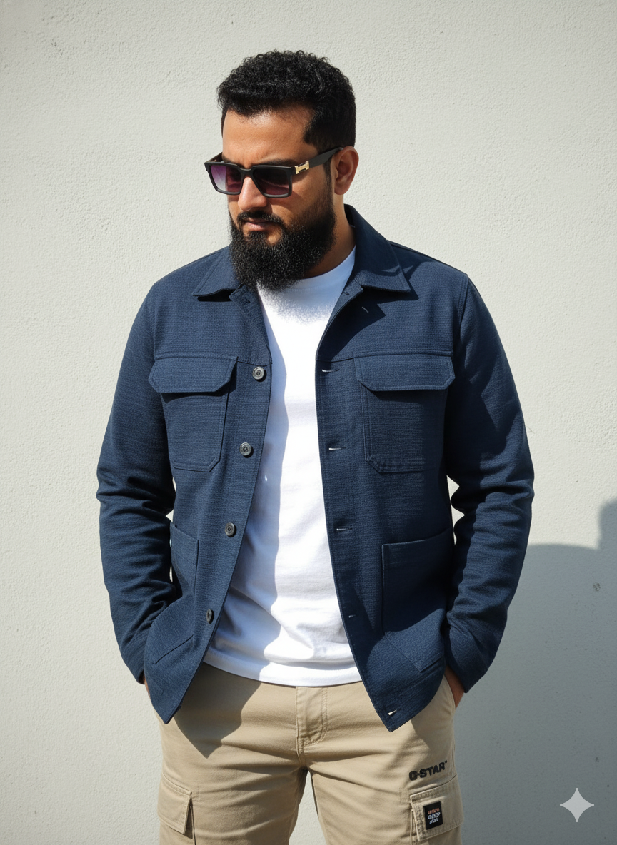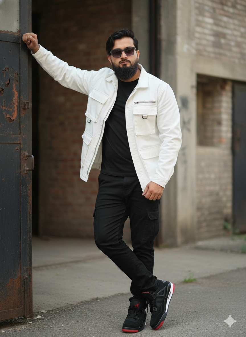 A loose maroon linen top, a white t-shirt, and grey cargo trousers (lacking side pockets), paired with white sneakers and a silver analog watch on his left wrist. Strong, influencer-style appearance with a relaxed pose (one leg crossed, hand in pocket, glancing to the side, smiling). Fuzzy background of a hill station, using natural light, high contrast, embodying a Gen Z style. The individual displays identical facial features, hairstyle, and beard shape as mentioned in the reference, “his haircut and beard are of the same style”.