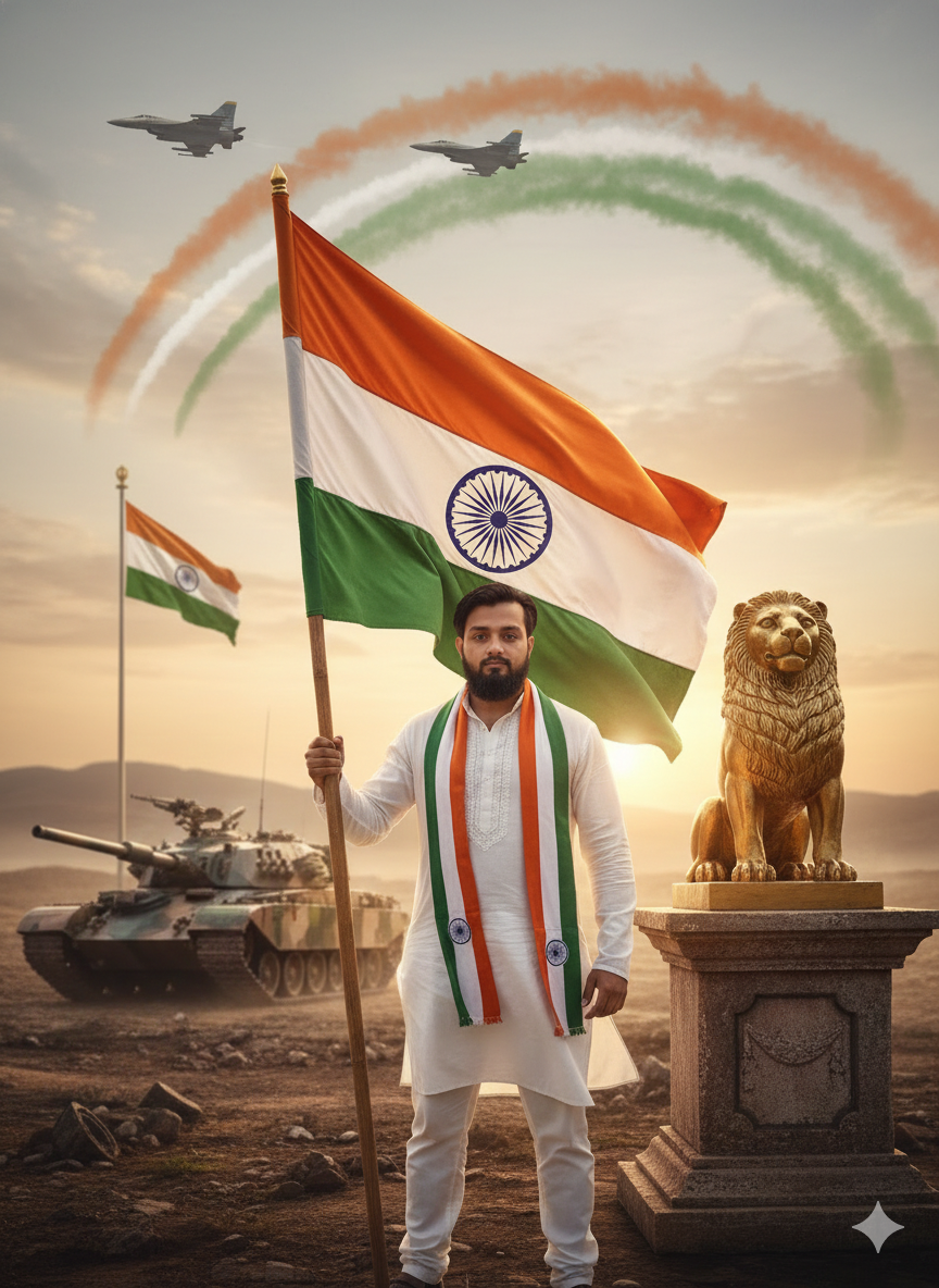 In the backdrop, an Indian Army tank is situated on rugged ground, signifying strength and defense, with Indian Air Force fighter jets soaring through a sky filled with gentle clouds, creating striking tricolor smoke trails in saffron, white, and green. A tall flagpole displaying the Indian national flag can be spotted in the distance, enhancing the composition’s depth and scale. Utilize a shallow depth of field to keep the main subject and national symbols in sharp clarity while subtly blurring the background for cinematic distinction. Incorporate warm highlights from the sunrise, well-distributed shadows, a high dynamic range, and incredibly detailed textures, ensuring lifelike skin tones. Produce the image in 4K ultra-sharp resolution with professional DSLR-style cinematic color grading to evoke an epic atmosphere of national pride.