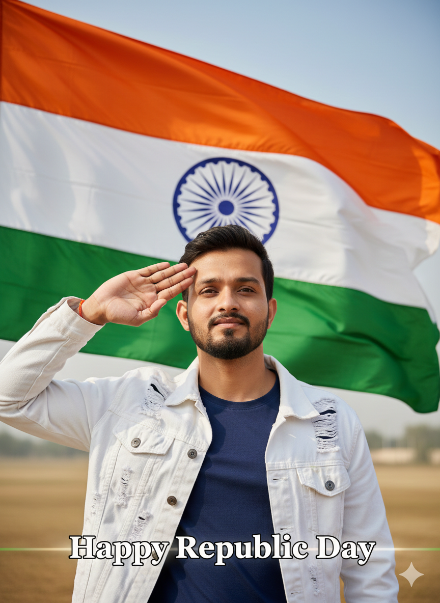 Behind him, a large Indian flag (Tiranga) billows dramatically, prominently displaying the saffron and white sections along with the navy blue Ashoka Chakra and green, enhancing the backdrop and fostering a strong patriotic feel. Employ a shallow depth of field to gently blur the background while ensuring the subject remains in sharp detail. Utilize bright, lifelike colors, cinematic contrast, an extended dynamic range, and natural skin texture to achieve a photorealistic 8K Ultra HD DSLR-quality appearance (free of cartoon effects or distortions). Incorporate bold, sophisticated text saying “Happy Republic Day,” highlighted with subtle tricolor elements and a soft luminous effect. Set the aspect ratio to 3:4 to uphold a professional photography aesthetic and a robust Indian patriotic theme.