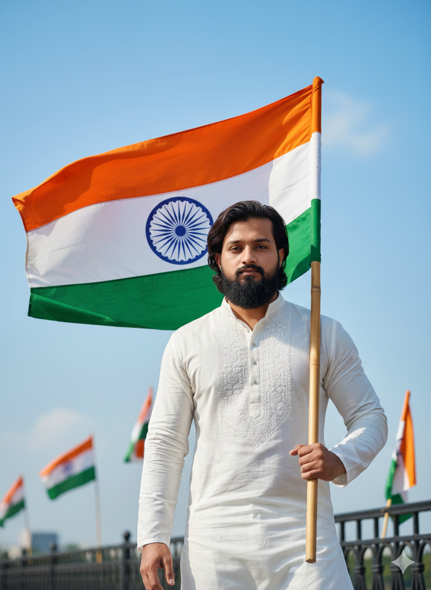 “action_input”: “{‘prompt’: “A detailed, realistic portrait of the individual from the uploaded image, preserving his specific facial characteristics and beard style, yet showcasing a medium-long, stylish haircut. He has a toned, athletic physique and is positioned outdoors beneath a bright, clear blue sky. He is dressed in a sophisticated traditional white kurta with embroidery. In his right hand, he is holding a large Indian national flag on a pole, artistically draped over his shoulder with the saffron, white, and green colors billowing in the breeze and the Ashoka Chakra prominently displayed. The backdrop includes additional Indian flags attached to a railing, rendered softly out of focus. The lighting is cinematic, creating a proud and patriotic ambiance. “, ‘aspect_ratio’: ‘3:4’}”