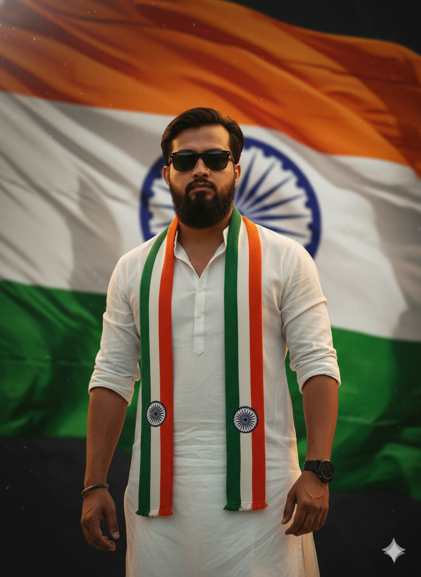 A striking Indian figure confidently positioned at the forefront on Republic Day, 26 January, reminiscent of a mass-action film hero, exuding understated sophistication. Captured from a low-angle perspective, he stands firmly with a composed expression. Adorned in a crisp white kurta with a luxurious fabric, he has rolled up sleeves, paired with blue jeans, a black wristwatch, and an Indian tricolor scarf elegantly draped around his neck, along with dark sunglasses that convey authority. In the backdrop, the Indian flag dominates the scene, fluttering slowly with deep, vibrant colors featuring the prominent Ashoka Chakra. A gentle breeze lifts both the scarf and the hem of the kurta. The lighting is of premium quality, featuring subtle highlights and intense shadows, with a warm golden hue balanced by cooler tones. The atmosphere is nearly devoid of dust and light particles, featuring a soft film grain and a shallow depth of field, offering an ultra-realistic depiction of his skin texture. The aesthetic mirrors that of a high-end Indian mass-cinema poster, combining a heroism that is graceful, emotional, and inspiring, encapsulating cinematic authenticity.