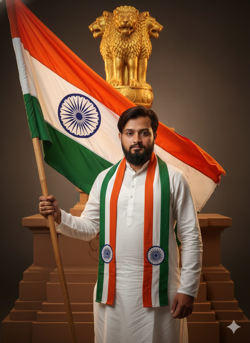 Produce an incredibly realistic, cinematic 8K image of a young Indian man who exudes pride as he stands confidently before the Golden Ashoka Pillar Emblem. He clasps the Indian flag in one hand, while a flowing tricolor dupatta (in saffron, white, and green) cascades elegantly over his shoulders, ensuring that the Ashoka Chakra is prominently displayed on the white portion. The man is attired in a neatly tailored white kurta-pajama that gives him a dignified and traditional appearance. His hair is styled neatly, and his demeanor reflects confidence, serenity, and patriotism, along with a straight and composed posture. Employ warm, striking studio lighting to accentuate the features of his face, the rich textures of the fabric, and the folds of the flag, fostering an awe-inspiring and majestic ambiance. Utilize a shallow depth of field to subtly blur the background, maintaining a sharp focus on the man and the national emblems. Render this with a high dynamic range, exquisite texture details, natural skin tones, and a premium DSLR-style cinematic quality for a powerful, poster-quality depiction of patriotism.