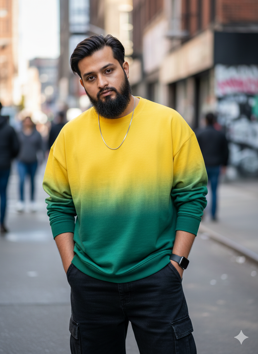 32 k Ultra Hyper Realistic, a full-body young boy dressed in an “Oversized yellow-deep green” sweatshirt with no chains beneath a gradient cotton attractive yellow and deep green tee, and black baggy cargo pants. His hand rests in his pocket, the hairstyle matches the uploaded image, head inclined downward in a natural pose directed at the camera. He sports an Apple Watch and a plain chain around his neck. A fashion street-style portrait, high quality, realistic lighting, 16K resolution.