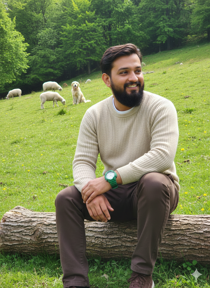 A relaxed outdoor portrait of a man seated on a big, toppled tree trunk in a green, grassy meadow. He has on a light beige textured sweater layered over a white crew neck tee, along with dark brown trousers and coordinating sneakers. On his wrist is a sizable watch with a white face and a green band. He is smiling and gazing to the side. In the backdrop, there is a gently inclining hillside adorned with a thick, vibrant green forest, sheep, and a dog. The illumination is gentle and comes from natural daylight. (Reference Face uploaded image) Use the same face upload image.