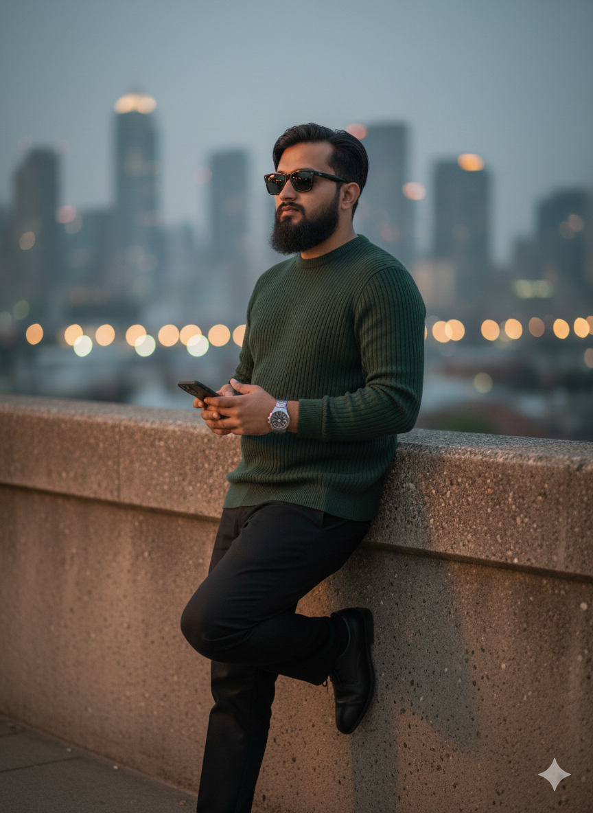 A stylish individual casually resting against a stone barrier as evening falls, gripping a mobile device in his hands. He dons a deep green knitted pullover, coordinating black pants, ebony leather footwear, and dark shades, complemented by a silver watch on his wrist. His beard is groomed well, and he displays a serene yet assured demeanor while gazing off to the side. The backdrop showcases an urban horizon with gentle, blurred lights and a reflective nighttime vibe. Use the same uploaded image of the face.