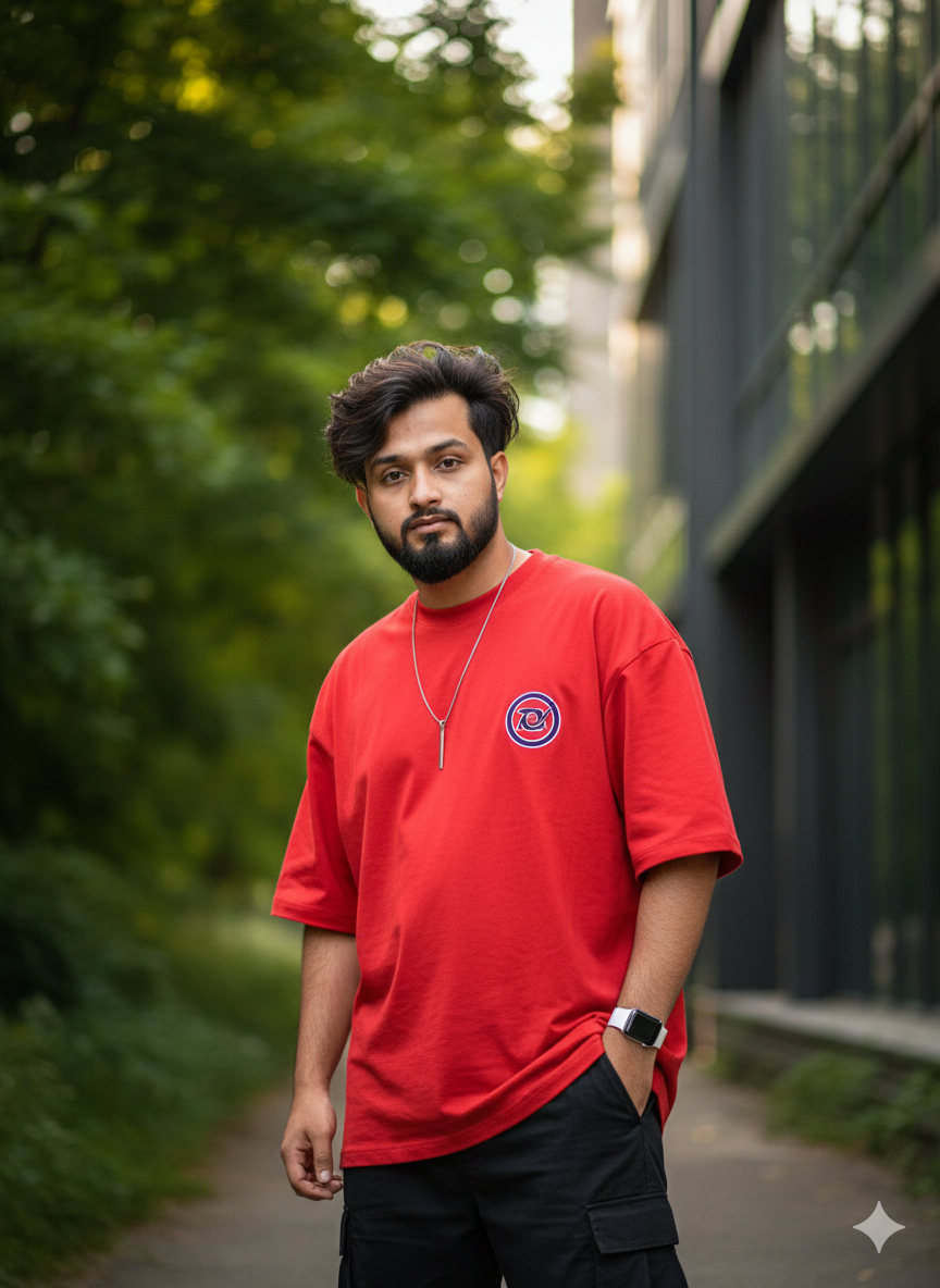 SIXTEEN THOUSAND ULTRA-REALISTIC IMAGE CREATION. A TRENDY YOUNG MAN WITH FULL, UNKEMPT HAIR DISPLAYS HIS CONFIDENCE WHILE STANDING OUTSIDE IN A COLORFUL NATURAL ENVIRONMENT. HE IS WEARING AN OVERSIZED RED SHIRT EMBELLISHED WITH A LOGO, LOOSE BLACK CARGO PANTS, A PENDANT WITH A VERTICAL BAR, AND A BLACK AND WHITE APPLE WATCH. THE SCENERY BEHIND HIM IS VIBRANT AND URBAN, SOFTLY OUT OF FOCUS, ENHANCED BY CINEMATIC LIGHTING TO ACHIEVE AN ULTRA-REALISTIC DSLR-QUALITY PHOTO. (FOCUS ON THE RIGHT SIDE OF HIS FACE, USE A 100% MATCH TO THE UPLOADED PHOTO’S HAIRSTYLE).