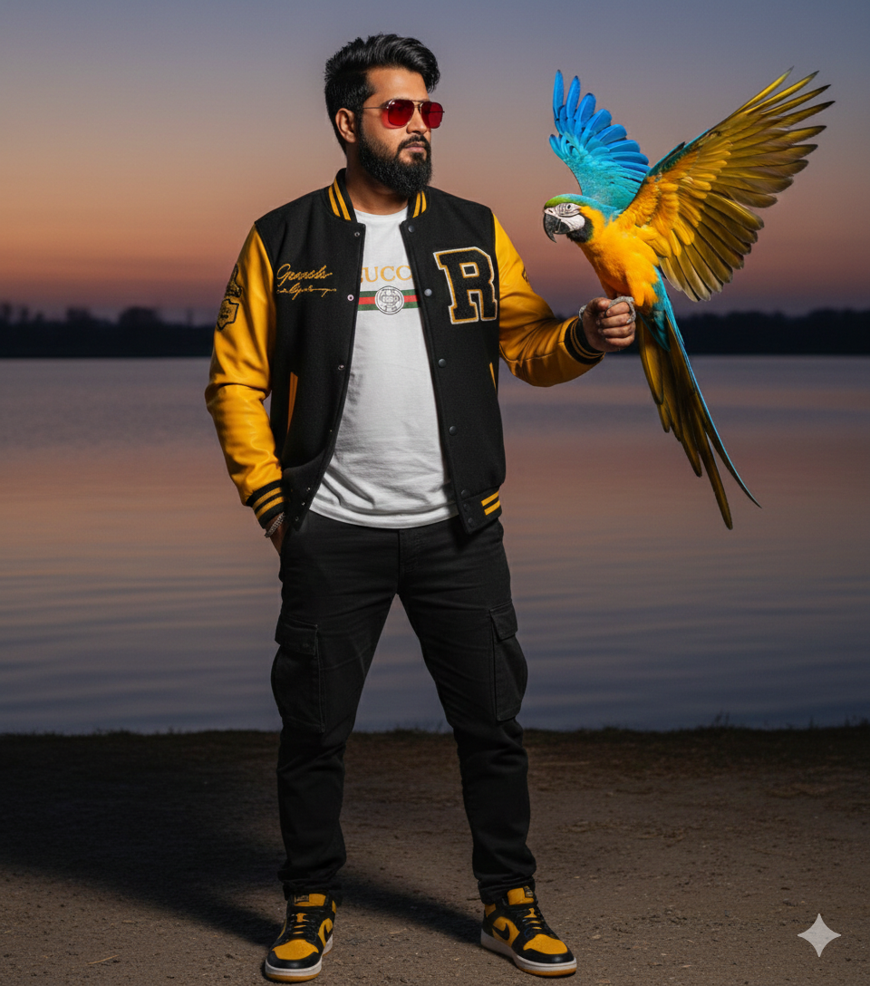 Extremely lifelike 12K RAW full-length cinematic 3:4 image of a 34-year-old male positioned near a tranquil lake during twilight. Wearing a white Gucci shirt, a black-and-yellow varsity jacket, black cargo trousers, a silver bracelet, a watch, and deep red shades along with yellow and black sneakers. One hand placed in his pocket while the other supports a large parrot colored in blue, yellow, and green with its wings extended. The water is still, reflecting the evening light, creating a moody cinematic atmosphere complemented by clear shadows and detailed feathers. -raw-stylize 200 -q 5 use the same face upload image