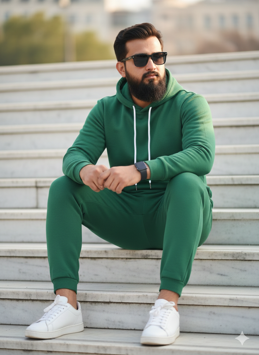 Ultra hyper-realistic A good-looking young man resting on outdoor white marble stairs. He is dressed in a fashionable white and green hoodie and jogger tracksuit, has tousled hair, white sneakers, rectangular sunglasses, and an Apple Watch. The lighting is soft and natural, with high-quality, professional photography featuring a shallow depth of field, focused clearly on the subject, in 16K resolution, taken with a DSLR camera. Use the same face to upload the image.