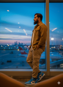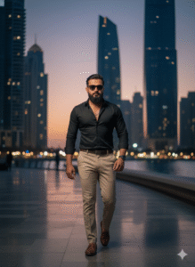 Ultra-realistic cinematic full-body fashion portrait of a stylish young man, using my exact face and hairstyle. He wears a fitted black button-down shirt with top buttons open, paired with tailored light beige trousers and brown loafers. A matching blazer is draped over his shoulder. Accessories include a sleek silver chain, a black wristwatch, and sunglasses. He walks confidently on a modern city waterfront at dusk, with skyscrapers glowing in the background, soft reflections on the floor.Use the same face upload image
