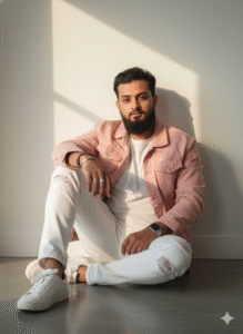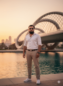 Ultra realistic 8K full-body portrait of the same man (exact face & hairstyle), standing confidently on Meydan Bridge, Dubai, during golden hour. Wearing a white fitted shirt, beige trousers, and white sneakers with sunglasses. Soft sunset glow, warm tones, cinematic lighting, detailed reflections — ultimately enhanced hyper-realistic. Use the same face upload image and hairstyle, which was long like model