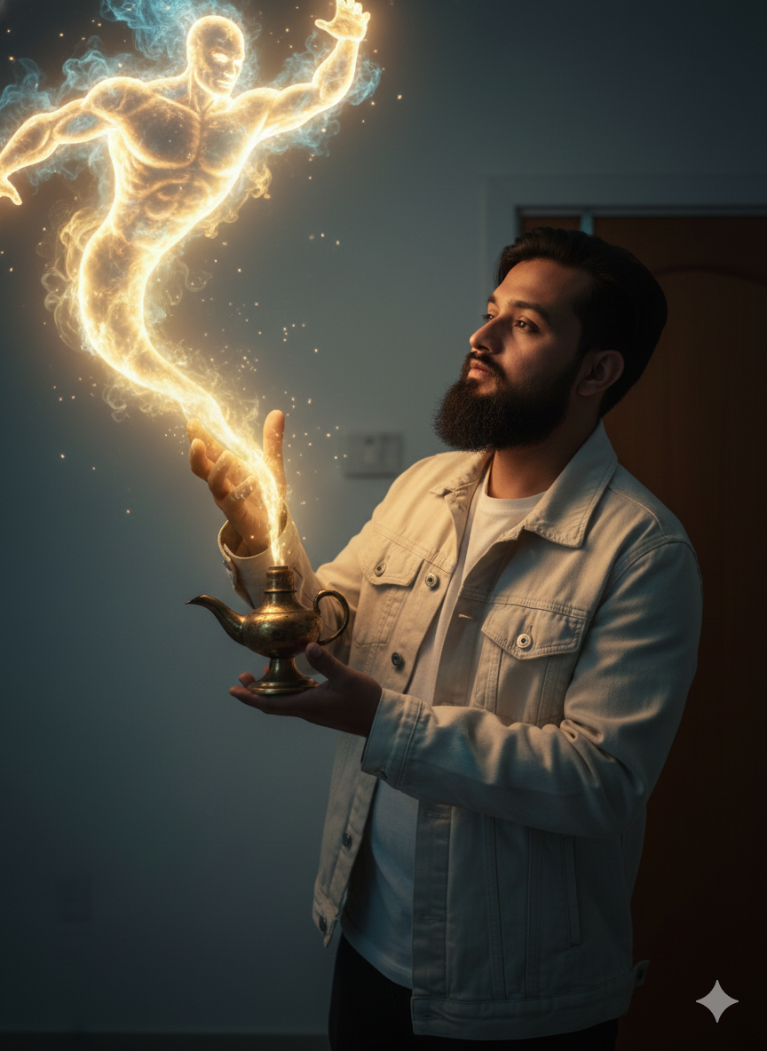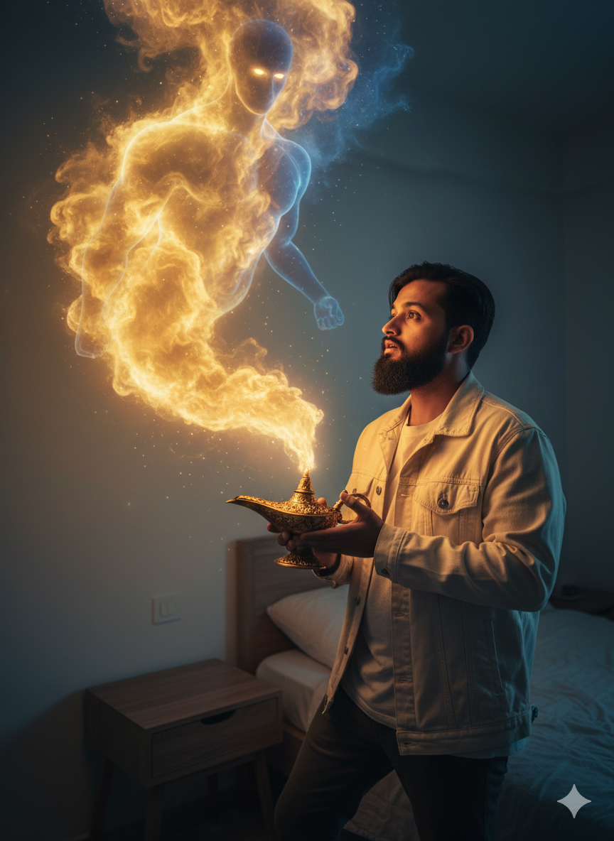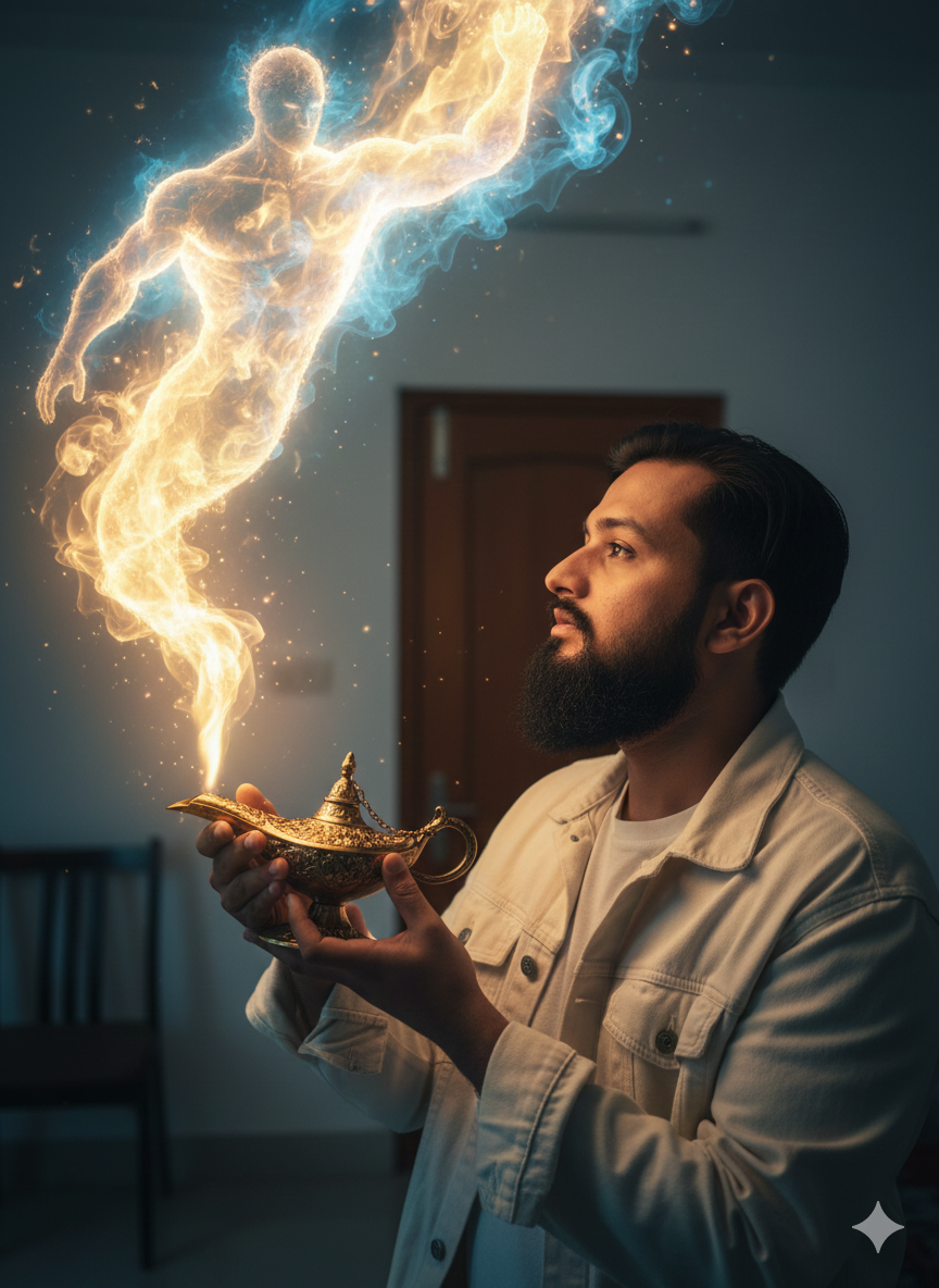 Arrangement: the subject fills the lower right third, while the genie takes up the upper left third. A cascade of golden smoke and light flows from the lamp, morphing into a vibrant genie figure (large cloud-like body without legs, with a mystical facial outline glowing in a golden-blue hue).