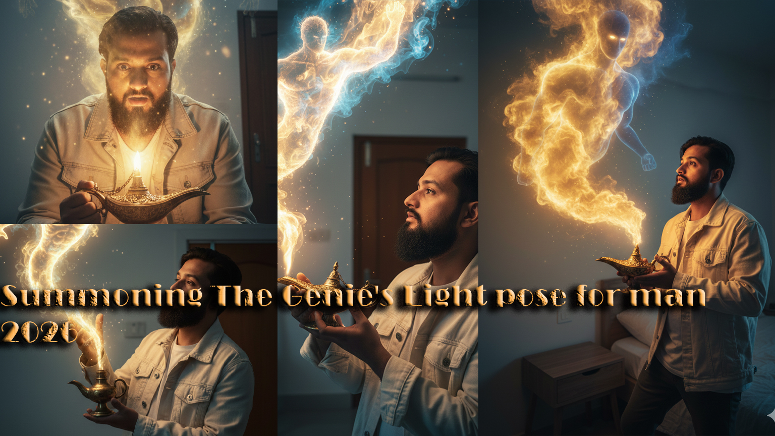 Arrangement: the subject fills the lower right third, while the genie takes up the upper left third. A cascade of golden smoke and light flows from the lamp, morphing into a vibrant genie figure (large cloud-like body without legs, with a mystical facial outline glowing in a golden-blue hue).
