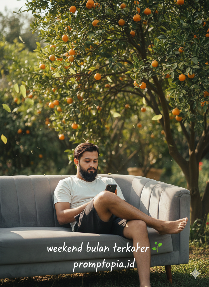 Detail yang sangat mendalam, realisme ekstrim, dan sinematografi super dengan rasio 9:16. Sudut pengambilan gambar: dari bawah dengan lembut sedikit ke atas, menangkap seorang pemuda (wajah dan rambut 100% sesuai referensi) yang tampak santai sedang bermain ponsel di sofa berbahan velour abu-abu yang empuk di halaman yang penuh dengan tanaman. Penampilan: kaos ringan berwarna putih gading, celana pendek gelap, tanpa alas kaki. Komposisi taman yang rimbun dengan pohon jeruk yang lebat daunnya, dengan buah-buah jeruk yang menggantung, dedaunan bergerak lembut.