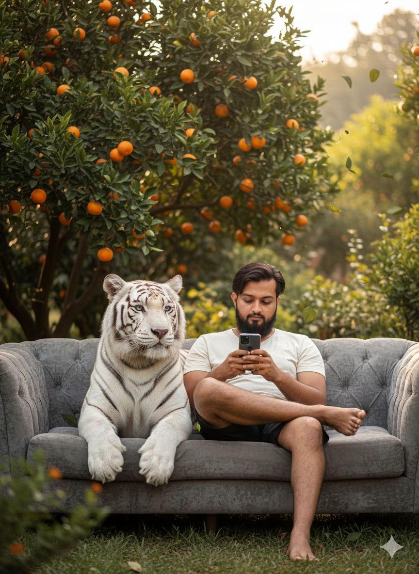 Detail yang sangat halus, realistis tingkat tinggi, rasio sinematik 9:16. Sudut pengambilan gambar: sudut rendah yang lembut, sedikit miring ke atas, menangkap sosok seorang pria muda (wajah dan rambut sepenuhnya sesuai referensi) yang santai sedang bermain ponsel di sofa berbahan beludru abu-abu yang empuk di halaman rumah yang dipenuhi tanaman. Pakaian: kaos tipis berwarna putih gading, celana pendek gelap, tanpa alas kaki. Komposisi taman yang lebat dengan pohon jeruk yang berdaun rimbun, buah jeruk tergantung, dedaunan bergerak lembut. Jangan mengubah wajah, unggah gambar dan harimau putih sedang duduk di samping model, buatlah terlihat realistis.