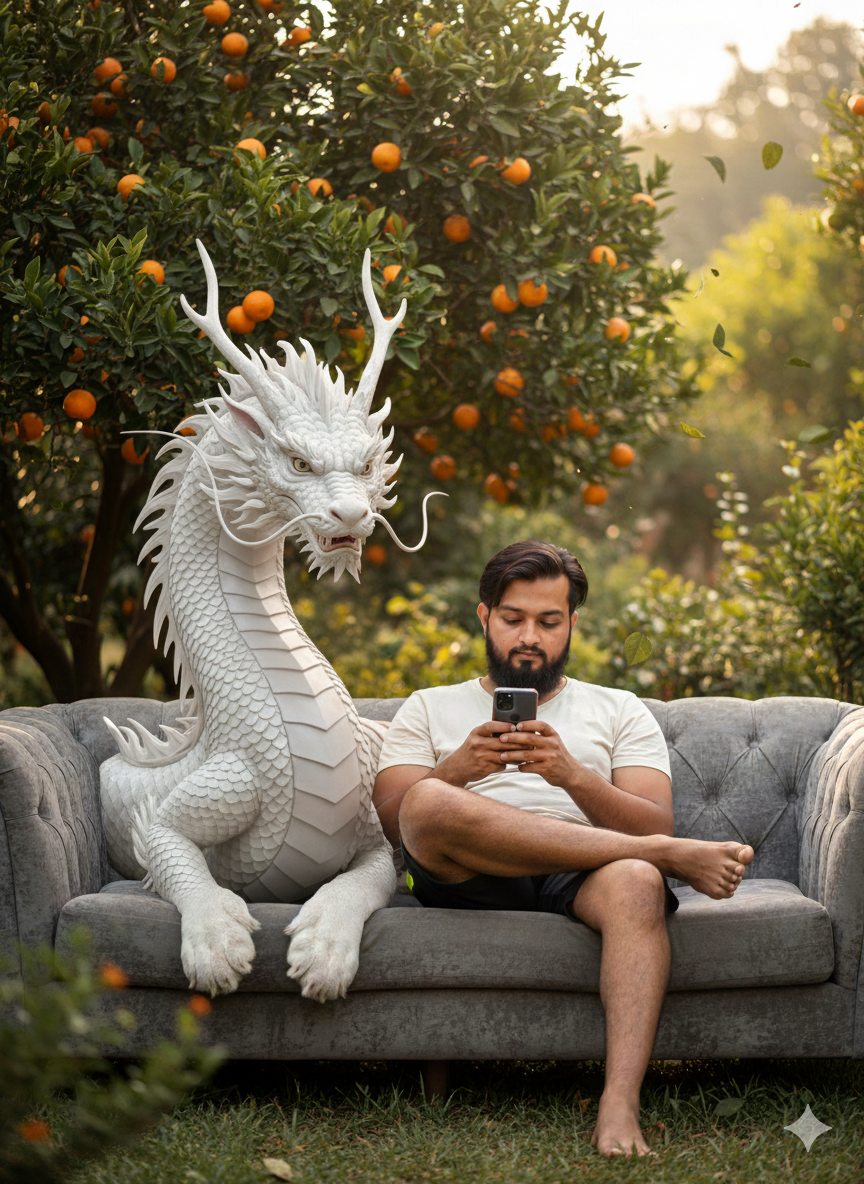 Ultra-detail, hyper-realistic, super cinematic aspect ratio 9:16. Camera angle: gently low-angle, slightly rising, capturing a young man (facial features and hair 100% accurate reference), relaxed while using a smartphone on a soft gray velvet sofa in a garden filled with plants. Attire: lightweight ivory-colored t-shirt, dark shorts, barefoot. Composition of a lush garden with a fruit tree, orange leaves dense with hanging oranges, foliage swaying. Additionally, ensure that the image of the face is replaced, featuring a white tiger alongside the model, and substitute the tiger with a white dragon.