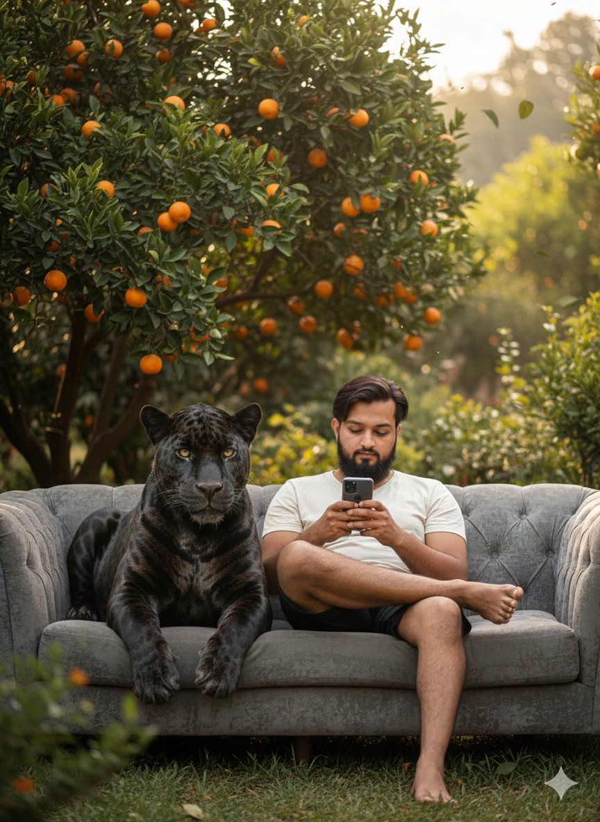 Ultra-detailed, hyper-realistic, and super cinematic ratio 9:16. The angle of the shot: a gentle low-angle shot, capturing a young man (face and hair fully based on reference), relaxing while using his phone on a soft gray velvet sofa in a garden filled with plants. Attire: a thin ivory white t-shirt, dark shorts, and no footwear. The garden composition includes a lush area with a citrus tree featuring thick foliage, with orange fruits hanging and leaves swaying. Please ensure that the face is not changed and that the white tiger positioned next to the model is realistically replaced with a black jaguar.